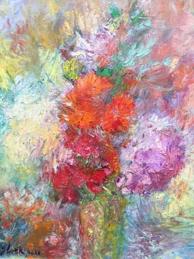 Met paletmes uitgevoerd, olieverf, afmeting 50 x 60 cm
