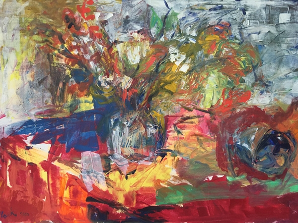 Een enthousiast werk, gemaakt met acrylverf naar aanleiding van een stilleven op een rode tafel, formaat 90 x 70 cm