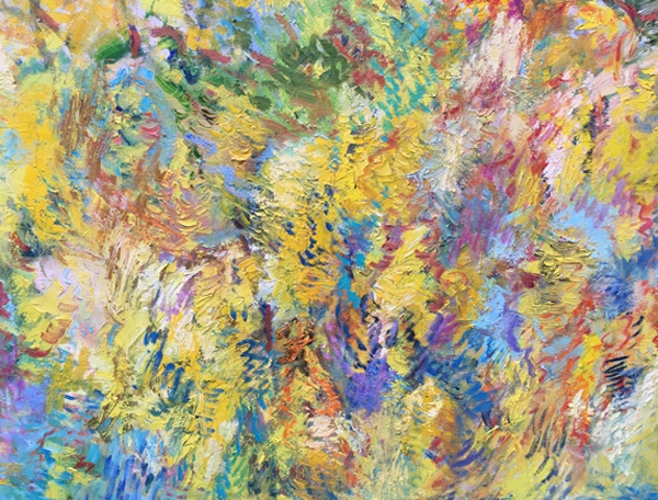 Impressie van de goudenregen, olieverf met paletmes, 67 x 57 cm