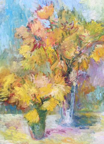 Transparant en lichtvol, met warme zachte tinten, olieverf met paletmes geschilderd, 60 x 70 cm