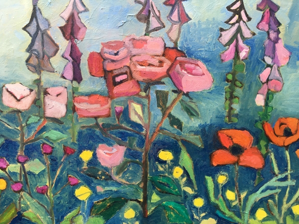 Rozen, digitalis en klaprozen op blauwe ondergrond, olieverf, formaat 80 x 60 cm