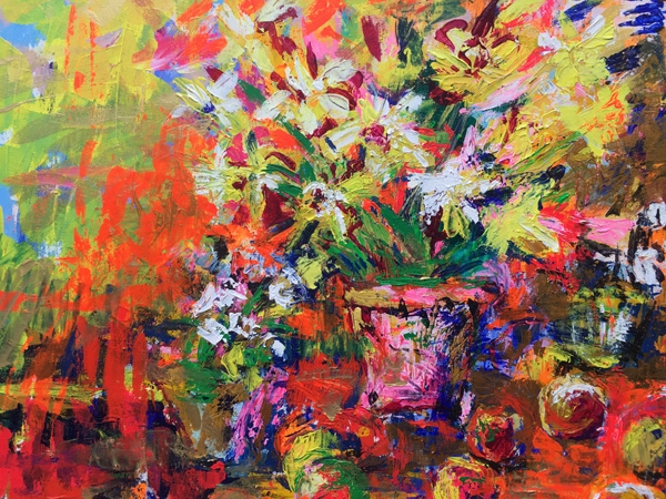 Narcissen en appels, acrylverf en goudverf, paletmes, 75 x 66 cm