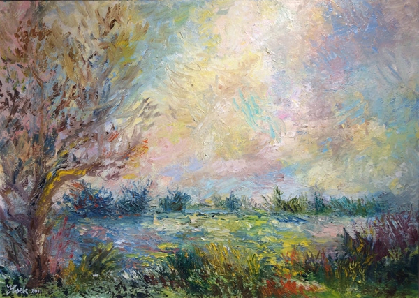 Licht in de lucht en op het water,olieverf met paletmes geschilderd, 50 x 70 cm