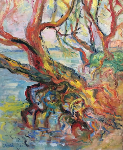 Wilgen aan de Waal met de tenen in het water, olieverf, formaat 50 x 60 cm